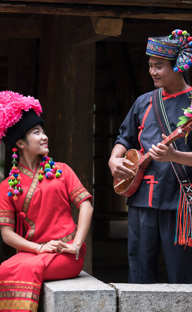 云南壯族主要聚居在文山州,人口114萬,民間的村寨大多依山傍水。壯族擅長種植水稻,有太陽崇拜和長老崇拜的風(fēng)俗,視銅鼓為重器,厚愛銀飾,善烹制五色花米飯,能歌善舞,熱情好客。進(jìn)入景區(qū)壯族村,迎面有祭祀龍王的龍柱,兩邊是先民繪制的天王崖畫和為紀(jì)念傳說洪水泛濫時(shí)幫助先民度過劫難而建的石葫蘆亭。祭祀玉皇大帝的昊天閣和傳說能驅(qū)邪納福的碩大銅鼓聳立在廣場兩側(cè)。桿欄式和麻欄式民居、壯族青年社交休憩的“情廊”、村...