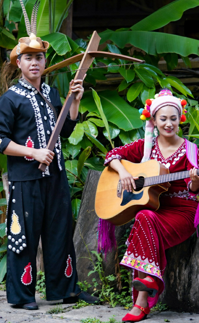 德昂族人口約1.7萬,主要分布在德宏州和保山市的潞西、梁河、瑞麗、隴川、隆陽等縣區(qū)。民居多為草排覆頂竹木結(jié)構(gòu)的干欄式建筑,眼前的德昂村建筑納入了能容納數(shù)十人居住的德昂大房子,氈帽頂?shù)男》孔?,還有頗具浪漫色彩的大公房、小公房……還建有“龍陽塔”標(biāo)志及佛教奘房、佛塔。德昂族民間普遍信奉南傳佛教,民俗活動(dòng)與佛事活動(dòng)關(guān)聯(lián)緊密。潑水節(jié)、開門節(jié)、關(guān)門節(jié)是重大節(jié)日。德昂族服飾色彩豐富,口頭文學(xué)特別是民歌創(chuàng)作活動(dòng)...